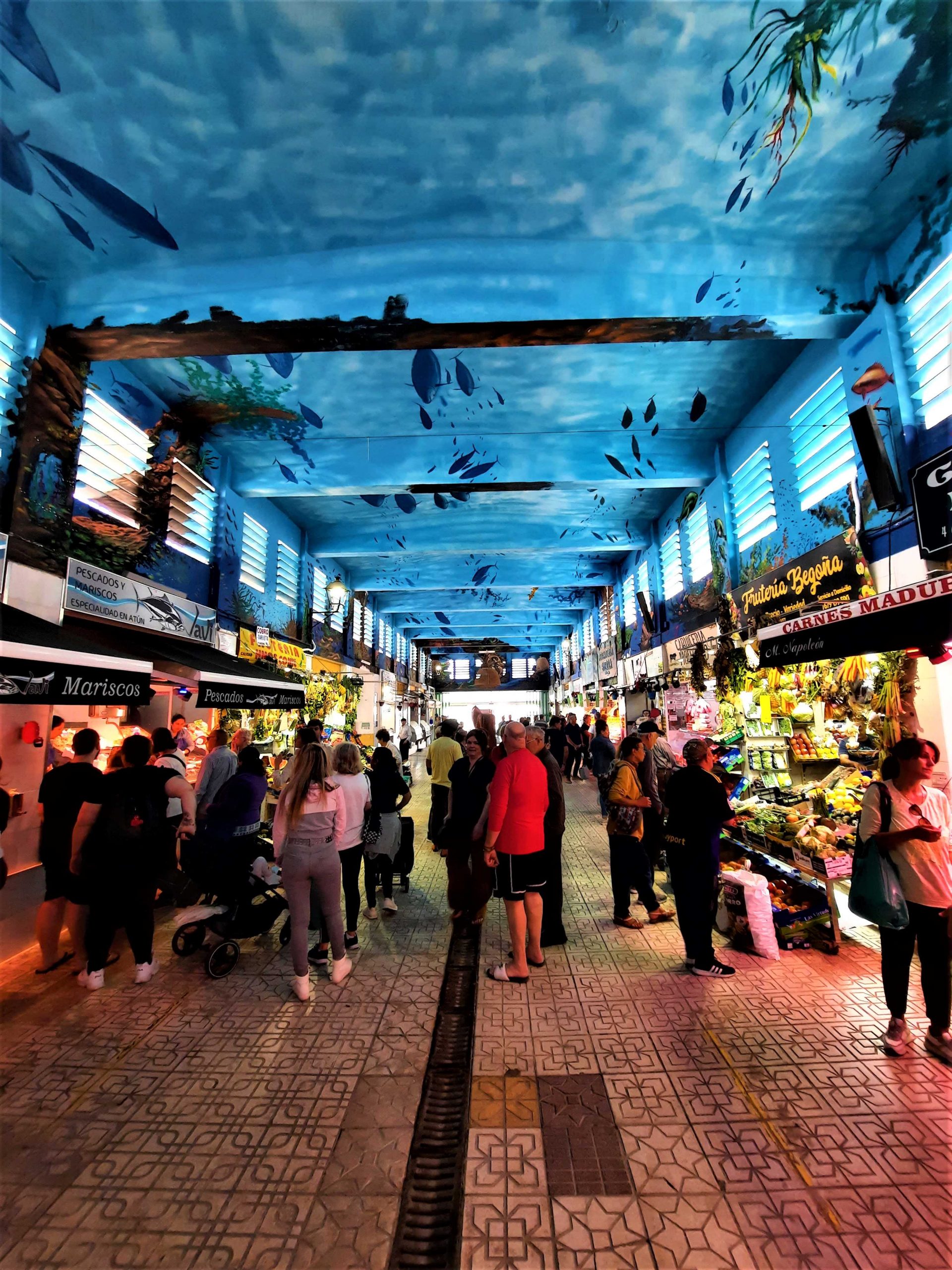 Mal se entra e é impossível não ficarmos fascinados pela pintura do seu teto, exemplarmente representativa da pesca do atum com almadrabas e da sua rota migratória. Nas suas laterais, as muitas bancas com os mais variados produtos que a região tem para oferecer … e se dúvidas houver sobre as suas qualidades, os sentidos não nos enganam … vê-se e cheira-se a frescura em cada textura, em cada cor e em cada detalhe. E depois … as pessoas que, mais do que virem às compras, ainda por aqui se perdem saudavelmente em dois dedos de conversa.