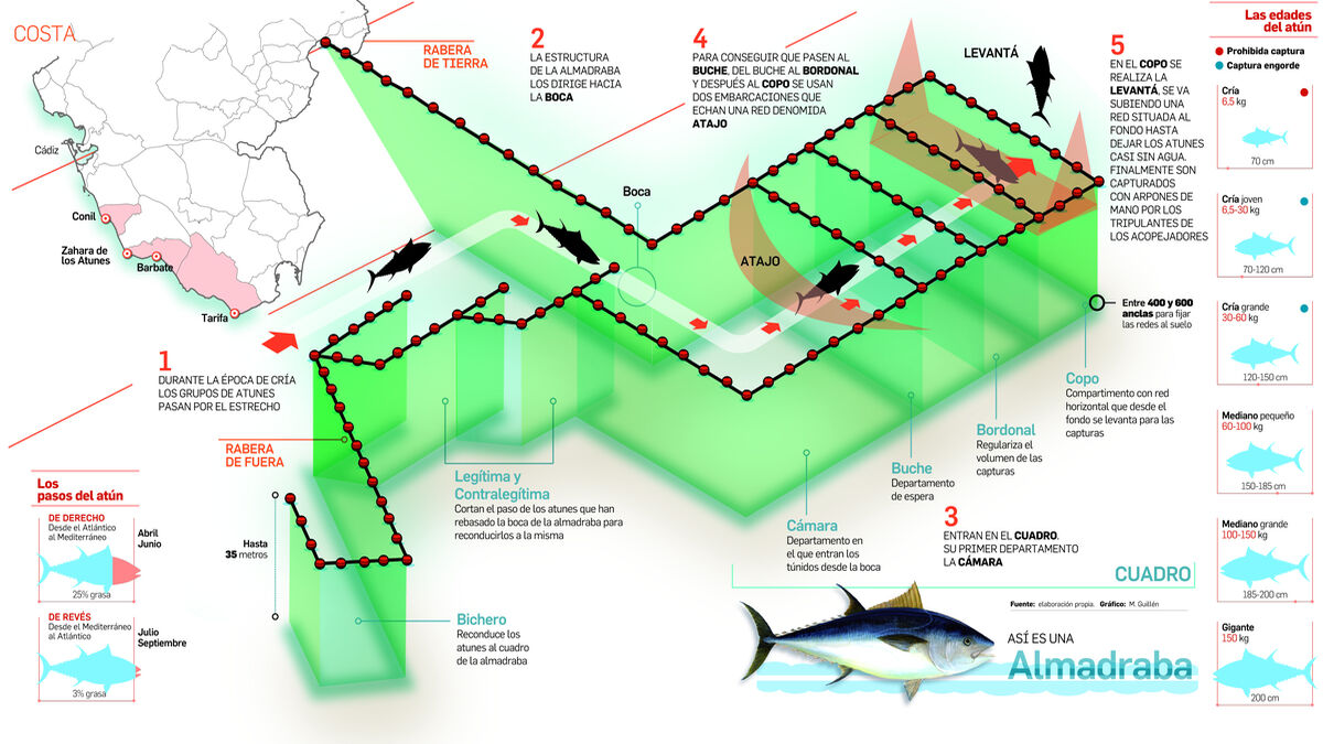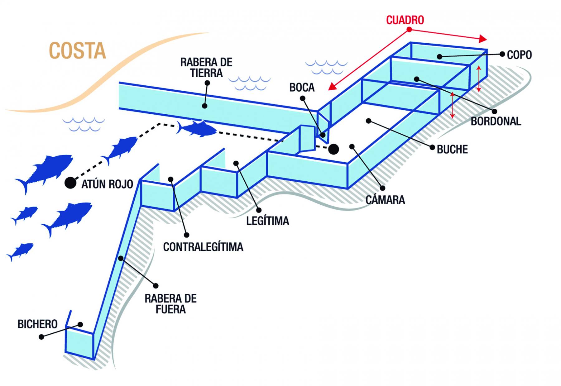Consiste na montagem sazonal de um labirinto de centenas de metros de cabos de aço, com redes de pesca fixas ao fundo, através de dezenas de pesadas âncoras de ferro e que forçam o atum a se dirigir para o “copo”; um cerco final constituído por uma rede suportada por barcos e que se vai fechando, à medida que os atuns de maior dimensão, vão ficando retidos nas suas malhas.
